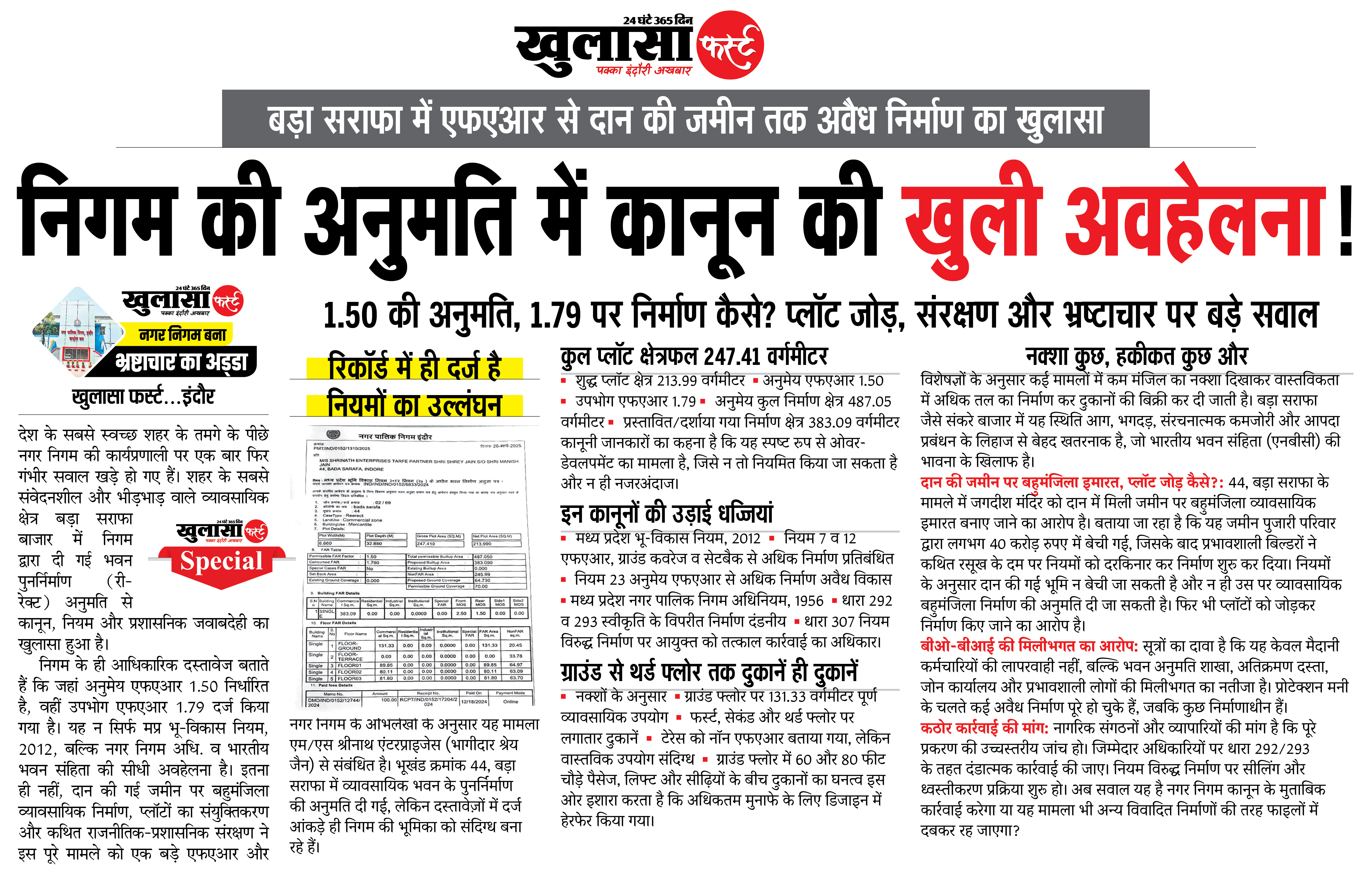 निगम की अनुमति में कानून की खुली अवहेलना: बड़ा सराफा में एफएआर से दान की जमीन तक अवैध निर्माण का खुलासा