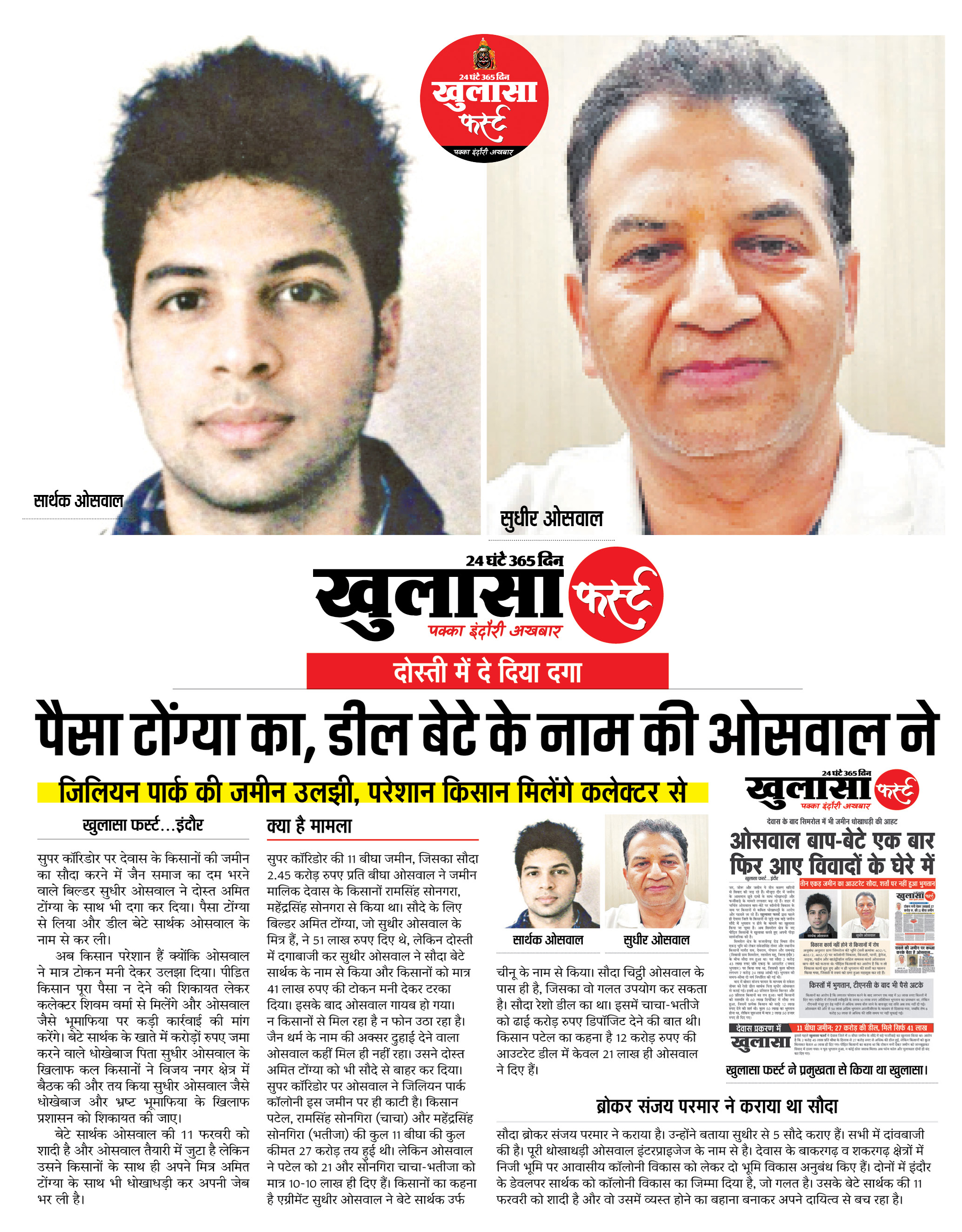 दोस्ती में दगा करते हुए देवास के तीन किसानों की सुपर कॉरिडोर स्थित जमीन हथियाने वाले भूमाफिया सुधीर ओसवाल और उसका बेटा सार्थक ओसवाल खुलासा फर्स्ट में हुए उनके कारनामों के खुलासे के बाद घबरा गए और किसानों से बोले कि अपनी जमीन वापस ले लो और पैसा दे दो। ओसवाल पिता-पुत्र के चेहरों पर खबर के बाद डर के भाव साफ दिख रहे थे।
