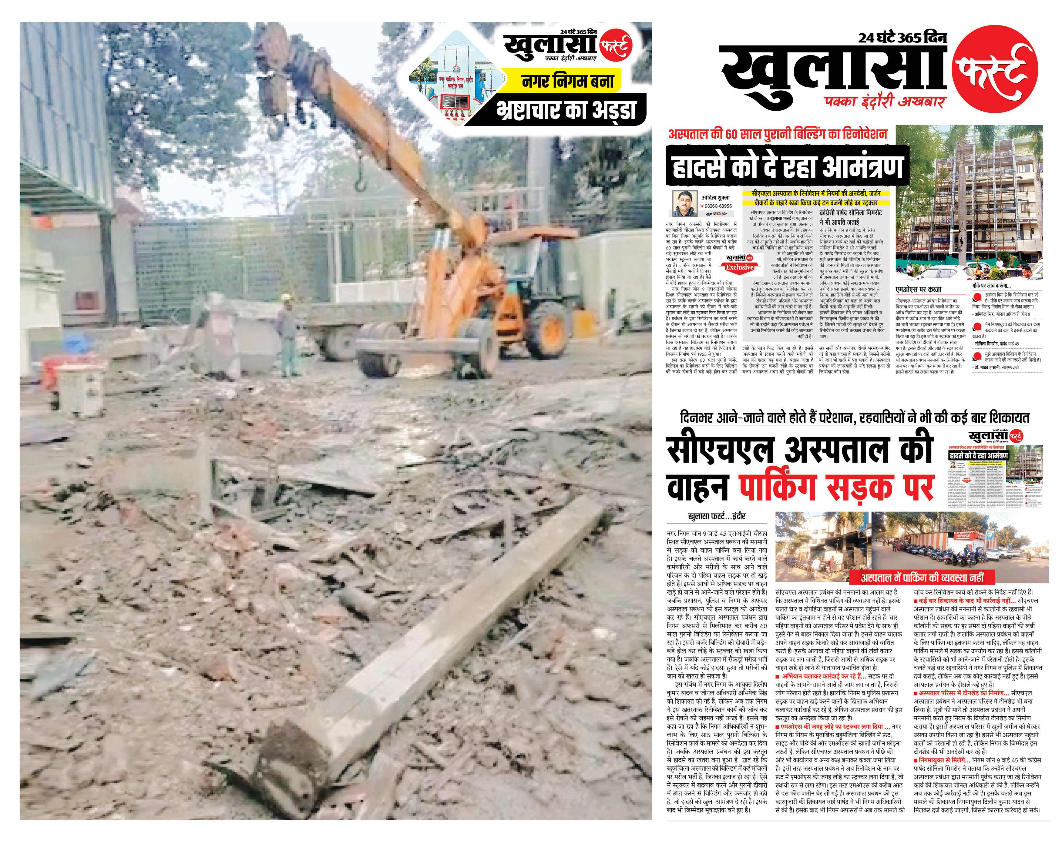 ज्ञात रहे कि एलआईजी स्थित सीएचएल अस्पताल प्रबंधन द्वारा नगर निगम से अनुमति लिए बिना ही अस्पताल में कराए जा रहे निर्माण कार्य को लेकर वार्ड 45 की पार्षद सोनिला मिमरोट ने एक महीने पहले ही निगमायुक्त से शिकायत की थी। उन्होंने कहा था कि यहां बिना मंजूरी के अवैध निर्माण हो रहा है और पार्किंग एरिया को कवर कर टीनशेड बना लिया गया है।