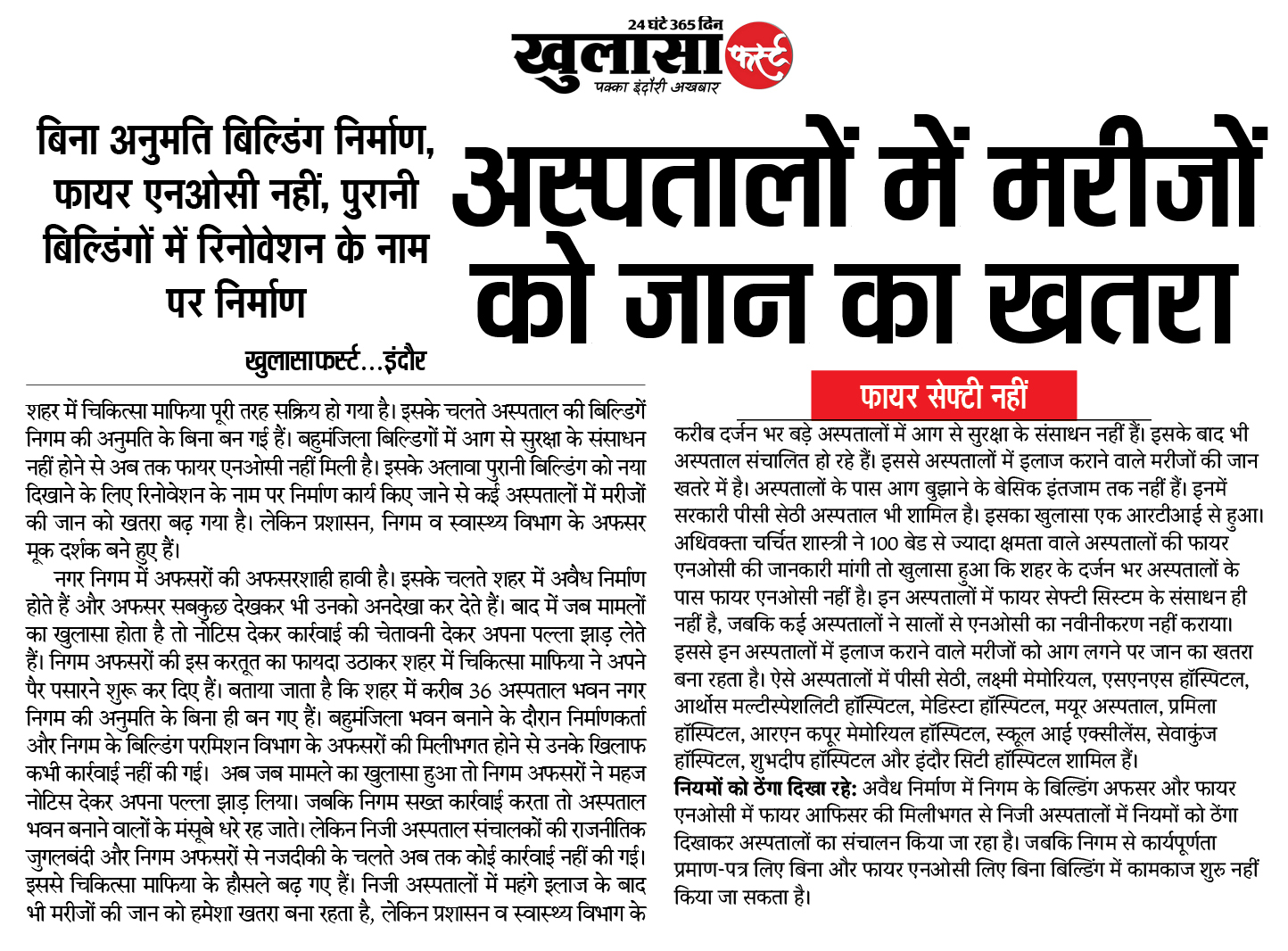 नियमों को ठेंगा दिखा रहे: अवैध निर्माण में निगम के बिल्डिंग अफसर और फायर एनओसी में फायर आफिसर की मिलीभगत से निजी अस्पतालों में नियमों को ठेंगा दिखाकर अस्पतालों का संचालन किया जा रहा है। जबकि निगम से कार्यपूर्णता प्रमाण-पत्र लिए बिना और फायर एनओसी लिए बिना बिल्डिंग में कामकाज शुरू नहीं किया जा सकता है।