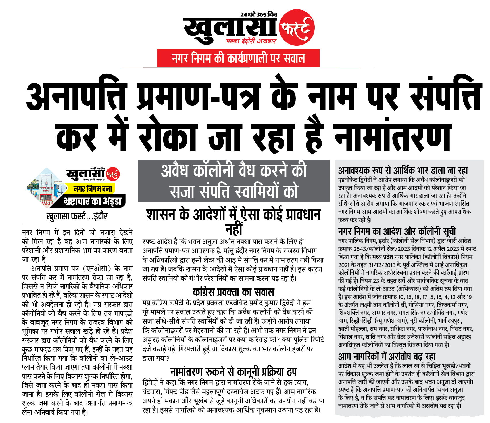 अनापत्ति प्रमाण-पत्र के नाम पर संपत्ति कर में रोका जा रहा है नामांतरण: अवैध कॉलोनी वैध करने की सजा संपत्ति स्वामियों को