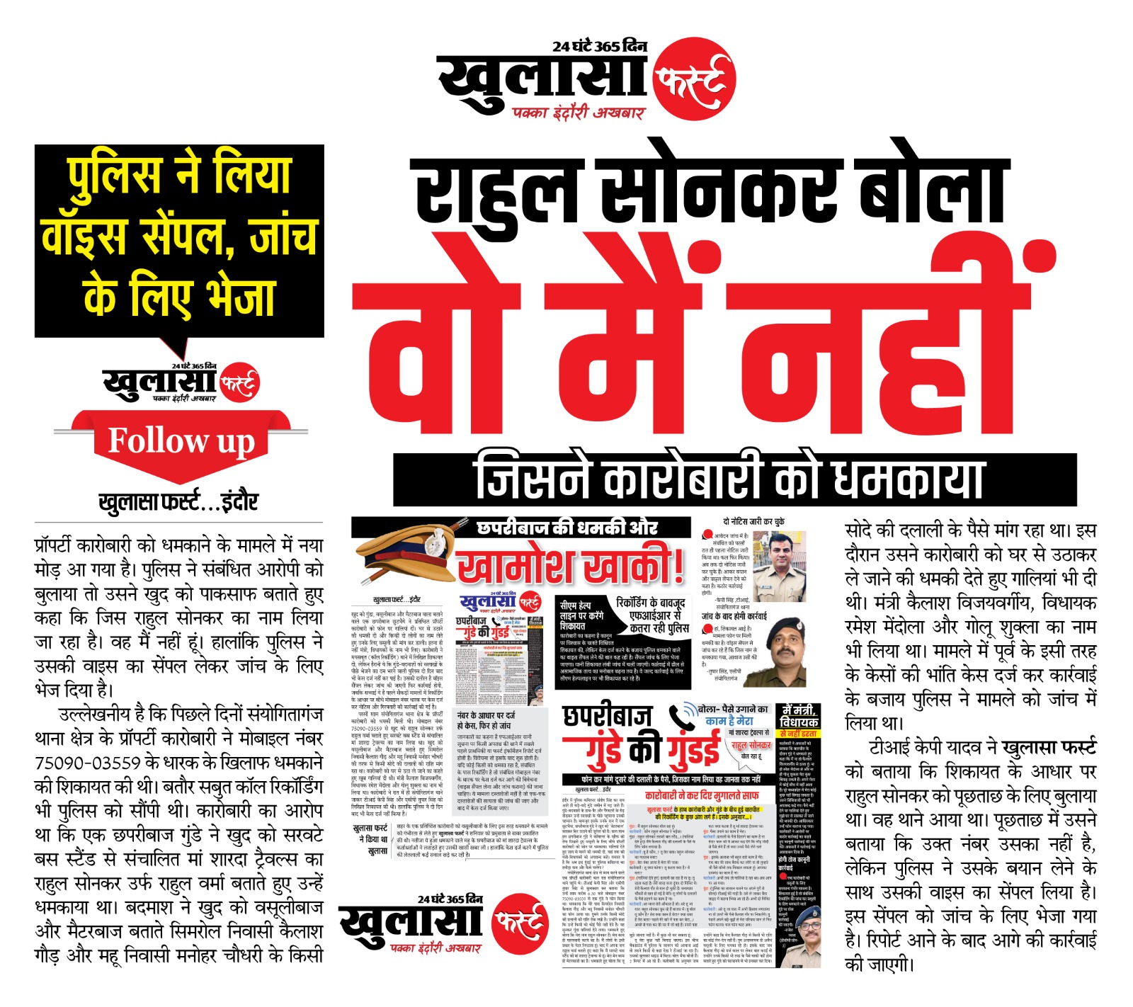 प्रॉपर्टी कारोबारी को धमकाने के मामले में नया मोड़ आ गया है। पुलिस ने संबंधित आरोपी को बुलाया तो उसने खुद को पाकसाफ बताते हुए कहा कि जिस राहुल सोनकर का नाम लिया जा रहा है। वह मैं नहीं हूं। हालांकि पुलिस ने उसकी वाइस का सेंपल लेकर जांच के लिए भेज दिया है।