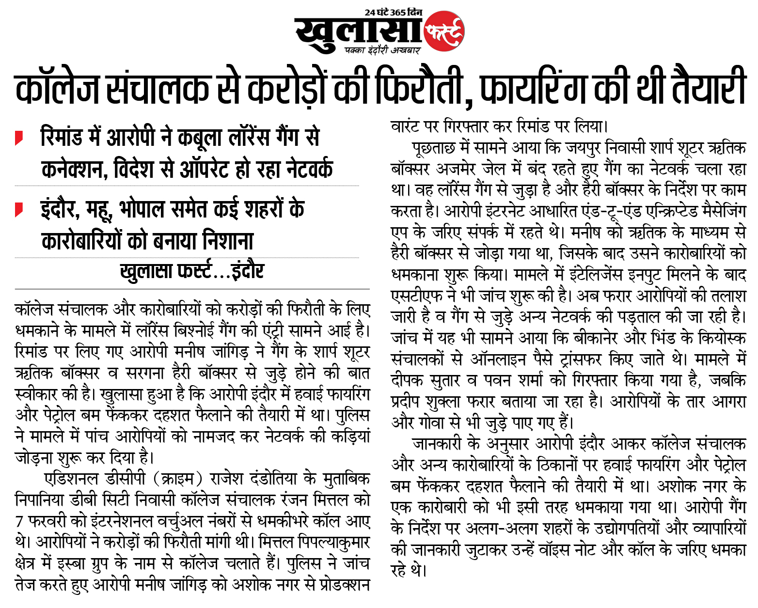 कॉलेज संचालक और कारोबारियों को करोड़ों की फिरौती के लिए धमकाने के मामले में लॉरेंस बिश्नोई गैंग की एंट्री सामने आई है। रिमांड पर लिए गए आरोपी मनीष जांगिड़ ने गैंग के शार्प शूटर ऋतिक बॉक्सर व सरगना हैरी बॉक्सर से जुड़े होने की बात स्वीकार की है। खुलासा हुआ है कि आरोपी इंदौर में हवाई फायरिंग और पेट्रोल बम फेंककर दहशत फैलाने की तैयारी में था। पुलिस ने मामले में पांच आरोपियों को नामजद कर नेटवर्क की कड़ियां जोड़ना शुरू कर दिया है।