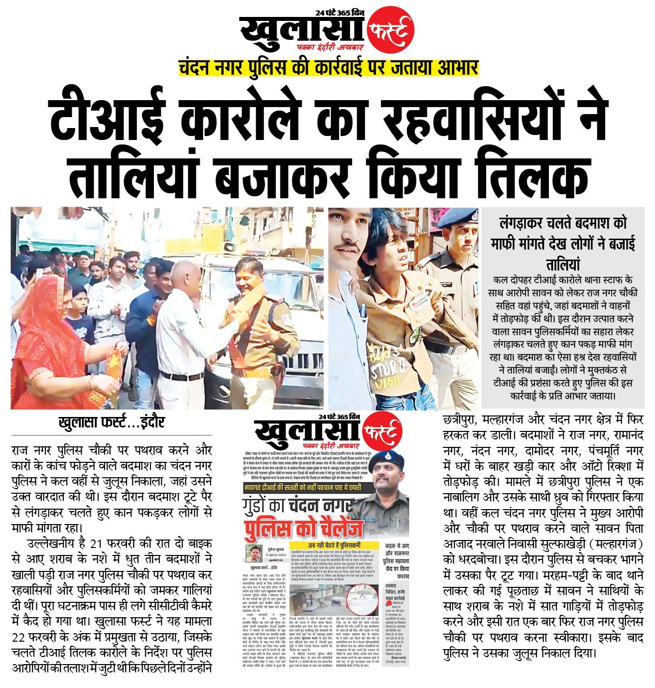 खुलासा फर्स्ट ने यह मामला 22 फरवरी के अंक में प्रमुखता से उठाया, जिसके चलते टीआई तिलक कारोले के निर्देश पर पुलिस आरोपियों की तलाश में जुटी थी कि पिछले दिनों उन्होंने छत्रीपुरा, मल्हारगंज और चंदन नगर क्षेत्र में फिर हरकत कर डाली।