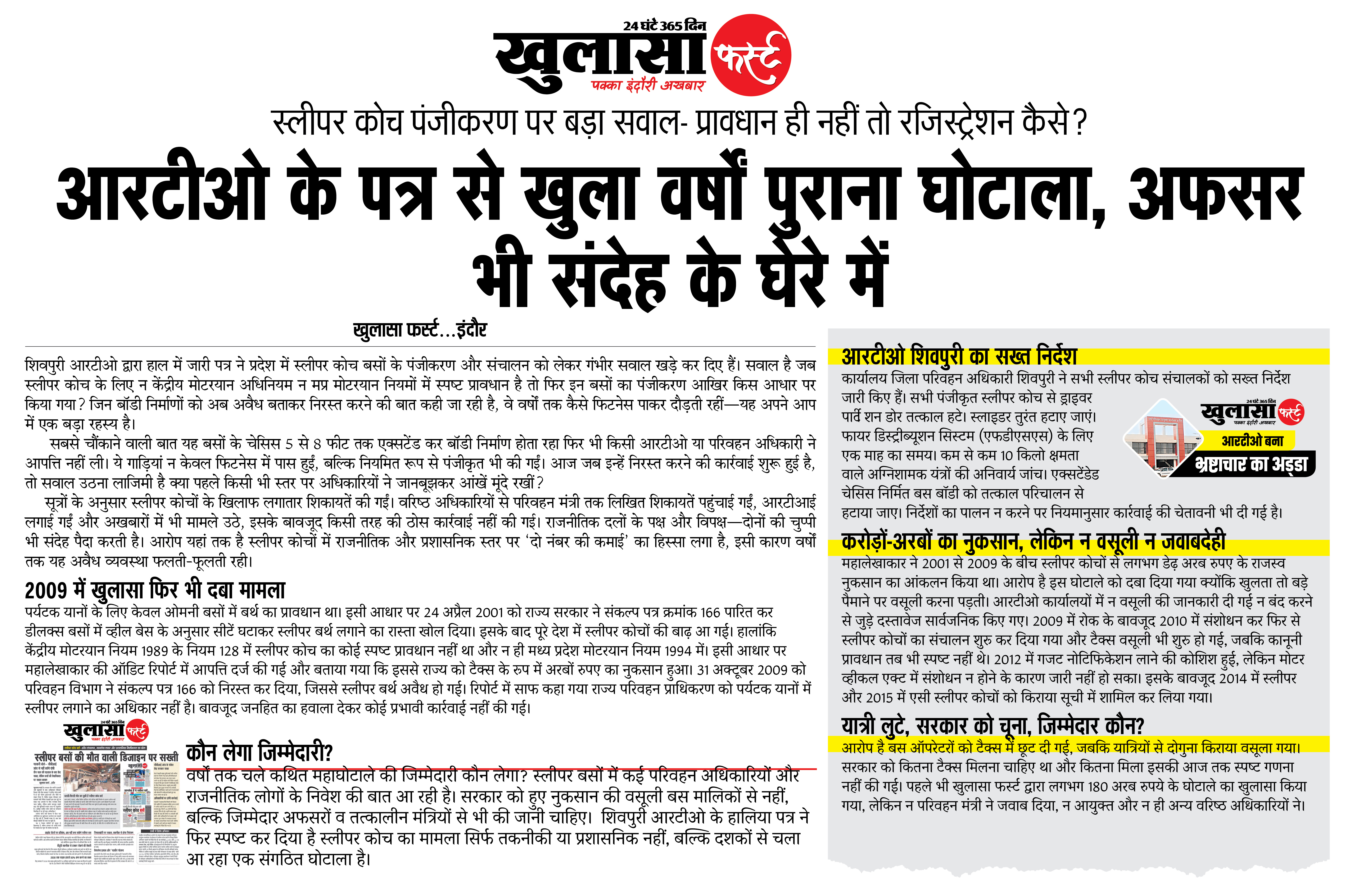 आरटीओ के पत्र से खुला वर्षों पुराना घोटाला: अफसर भी संदेह के घेरे में ;स्लीपर कोच पंजीकरण पर बड़ा सवाल प्रावधान ही नहीं तो रजिस्ट्रेशन कैसे