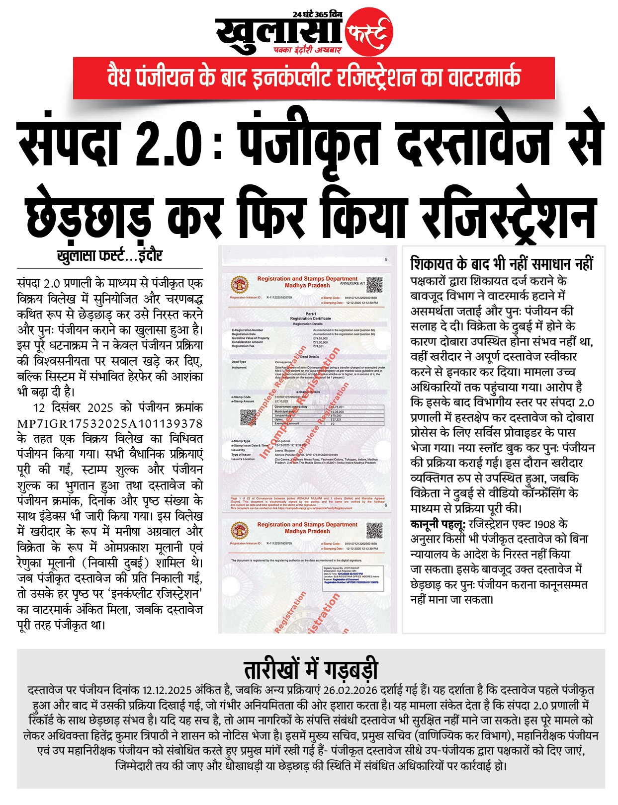 दस्तावेज पर पंजीयन दिनांक 12.12.2025 अंकित है, जबकि अन्य प्रक्रियाएं 26.02.2026 दर्शाई गई हैं। यह दर्शाता है कि दस्तावेज पहले पंजीकृत हुआ और बाद में उसकी प्रक्रिया दिखाई गई, जो गंभीर अनियमितता की ओर इशारा करता है।