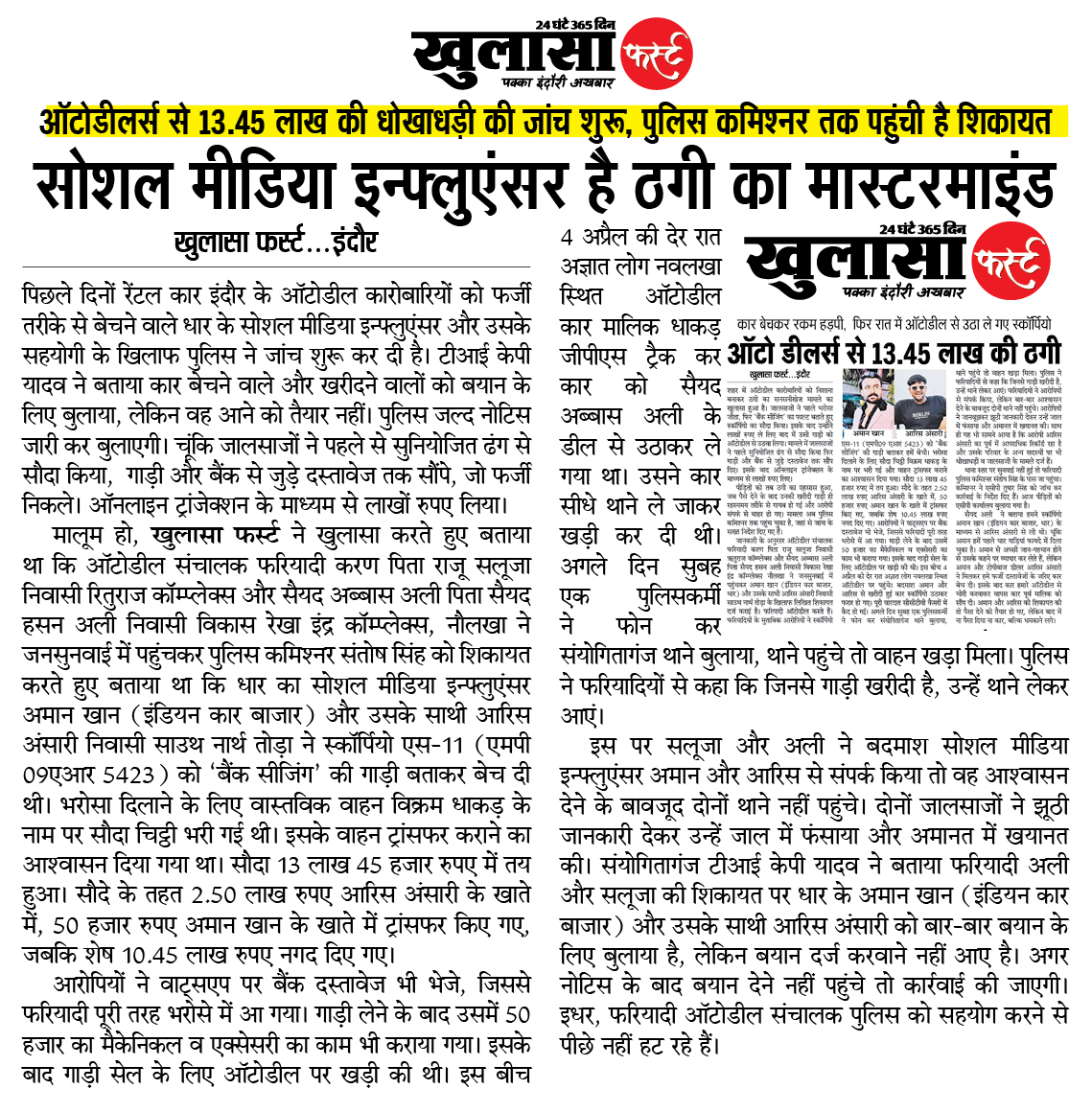 मालूम हो, खुलासा फर्स्ट ने खुलासा करते हुए बताया था कि ऑटोडील संचालक फरियादी करण पिता राजू सलूजा निवासी रितुराज कॉम्प्लेक्स और सैयद अब्बास अली पिता सैयद हसन अली निवासी विकास रेखा इंद्र कॉम्प्लेक्स, नौलखा ने जनसुनवाई में पहुंचकर पुलिस कमिश्नर संतोष सिंह को शिकायत करते हुए बताया था कि धार का सोशल मीडिया इन्फ्लुएंसर अमान खान (इंडियन कार बाजार) और उसके साथी आरिस अंसारी निवासी साउथ नार्थ तोड़ा ने स्कॉर्पियो एस-11 (एमपी 09एआर 5423) को ‘बैंक सीजिंग’ की गाड़ी बताकर बेच दी थी।