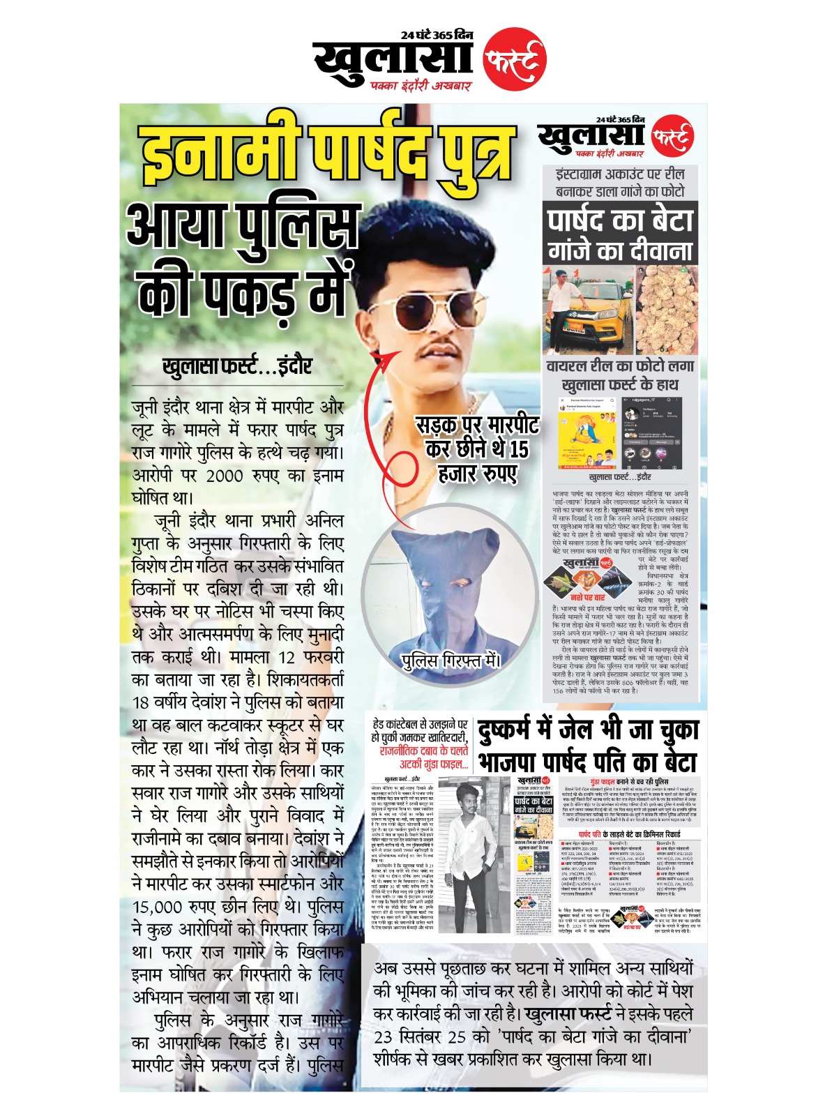 जूनी इंदौर थाना क्षेत्र में मारपीट और लूट के मामले में फरार पार्षद पुत्र राज गागोरे पुलिस के हत्थे चढ़ गया। आरोपी पर 2000 रुपए का इनाम घोषित था।