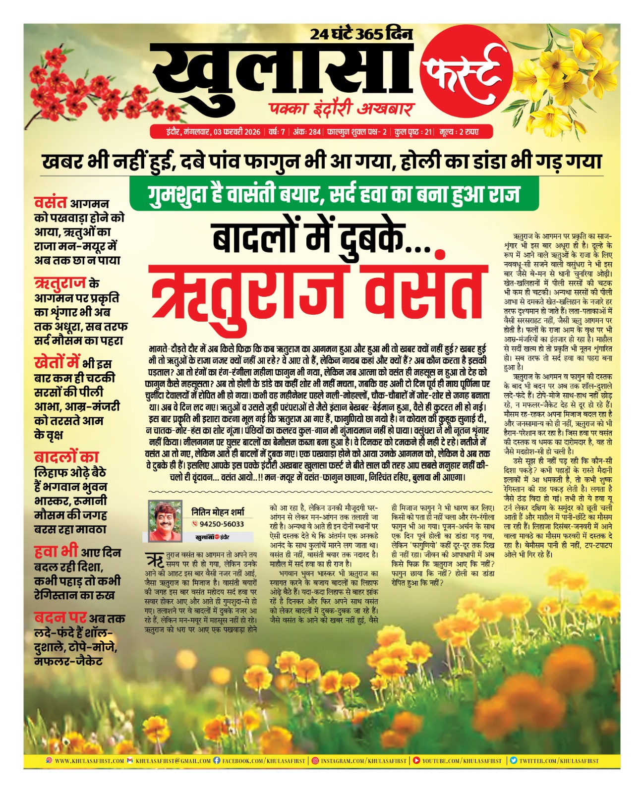 नतीजे में वसंत आ तो गए, लेकिन आते ही बादलों में दुबक गए। एक पखवाड़ा होने को आया उनके आगमन को, लेकिन वे अब तक वे दुबके ही हैं। इसलिए आपके इस पक्के इंदौरी अखबार खुलासा फर्स्ट ने बीते साल की तरह आप सबसे मनुहार नहीं की- चलो री वृंदावन... वसंत आयो..!! मन-मयूर में वसंत-फागुन छाएगा, निश्चिंत रहिए, बुलावा भी आएगा।