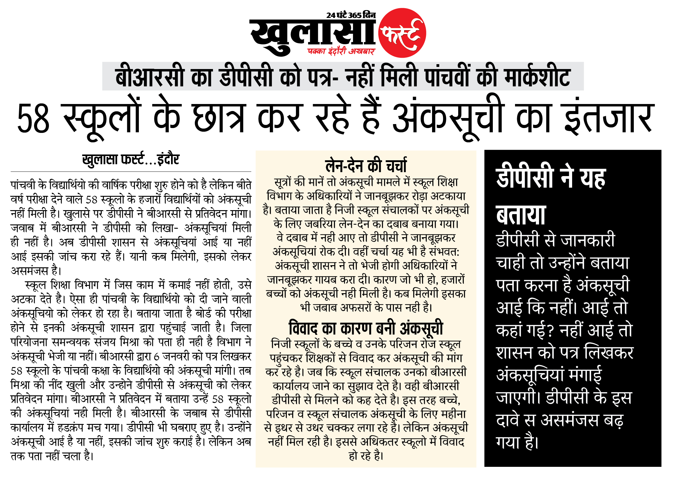 पांचवी के विद्यार्थियो की वार्षिक परीक्षा शुरु होने को है लेकिन बीते वर्ष परीक्षा देने वाले 58 स्कूलो के हजारों विद्यार्थियों को अंकसूची नहीं मिली है। खुलासे पर डीपीसी ने बीआरसी से प्रतिवेदन मांगा। जवाब में बीआरसी ने डीपीसी को लिखा- अंकसूचियां मिली ही नहीं है। अब डीपीसी शासन से अंकसूचियां आई या नहीं आई इसकी जांच करा रहे हैं। यानी कब मिलेगी, इसको लेकर असमंजस है।