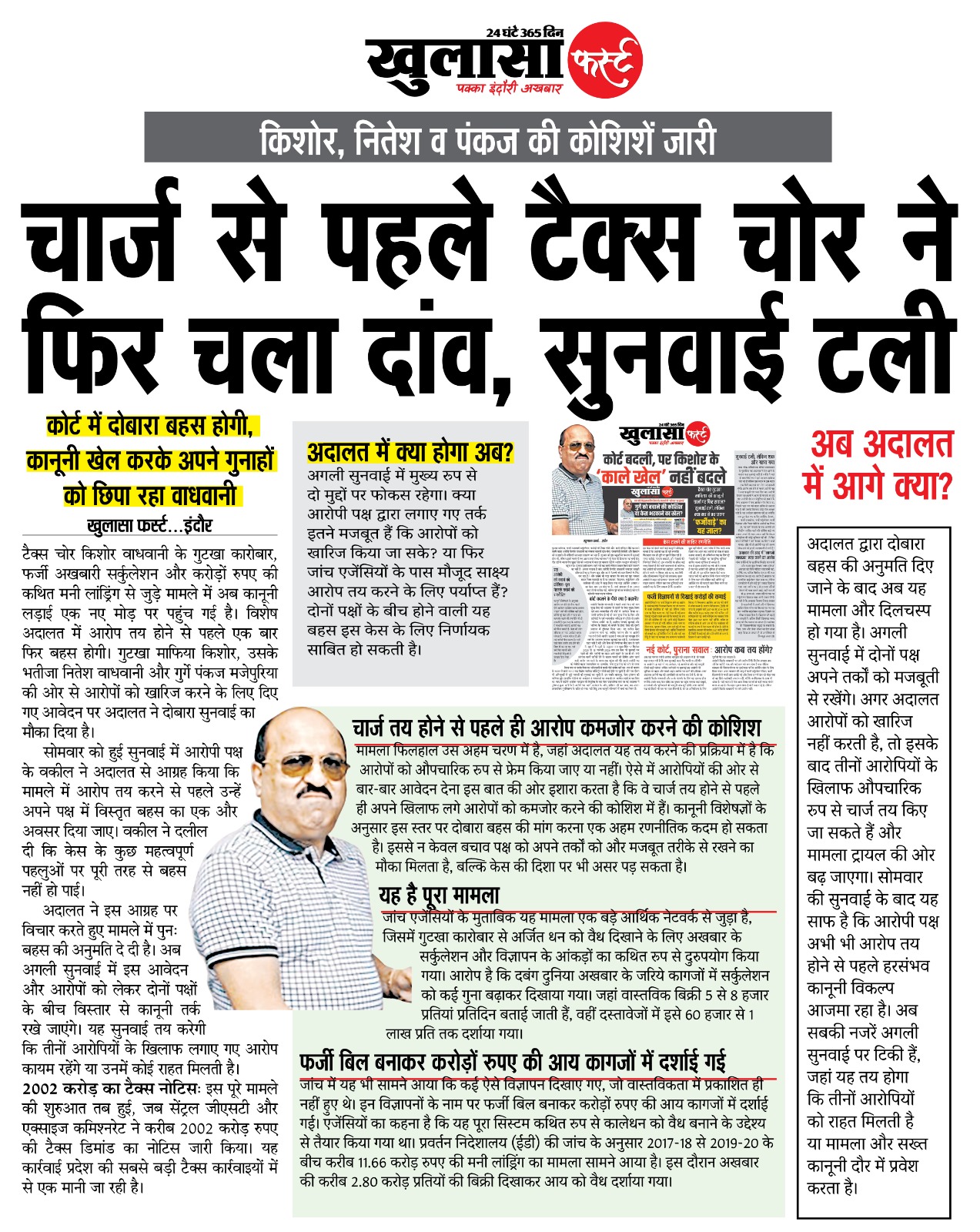 टैक्स चोर किशोर वाधवानी के गुटखा कारोबार, फर्जी अखबारी सर्कुलेशन और करोड़ों रुपए की कथित मनी लांड्रिंग से जुड़े मामले में अब कानूनी लड़ाई एक नए मोड़ पर पहुंच गई है। विशेष अदालत में आरोप तय होने से पहले एक बार फिर बहस होगी।