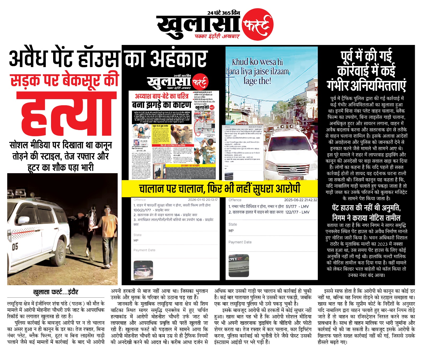 जानकारी के मुताबिक लसूड़िया थाना क्षेत्र की शिव वाटिका स्थित सागर समृद्धि एनक्लेव में हुए चर्चित हत्याकांड में आरोपी मोहनीश चौधरी उर्फ जाट की लापरवाह और आपराधिक प्रवृत्ति की परतें खुलती जा रही हैं। खुलासा फर्स्ट की पड़ताल में सामने आया कि आरोपी मोहनीश चौधरी को कम उम्र से ही ट्रैफिक नियमों की अनदेखी करने की आदत थी। करीब आधा दर्जन से अधिक बार उसकी गाड़ी पर चालान की कार्रवाई हो चुकी है। कई बार यातायात पुलिस ने उसकी कार पकड़ी, जबकि एक बार लसूड़िया पुलिस भी उसे पकड़ चुकी है।