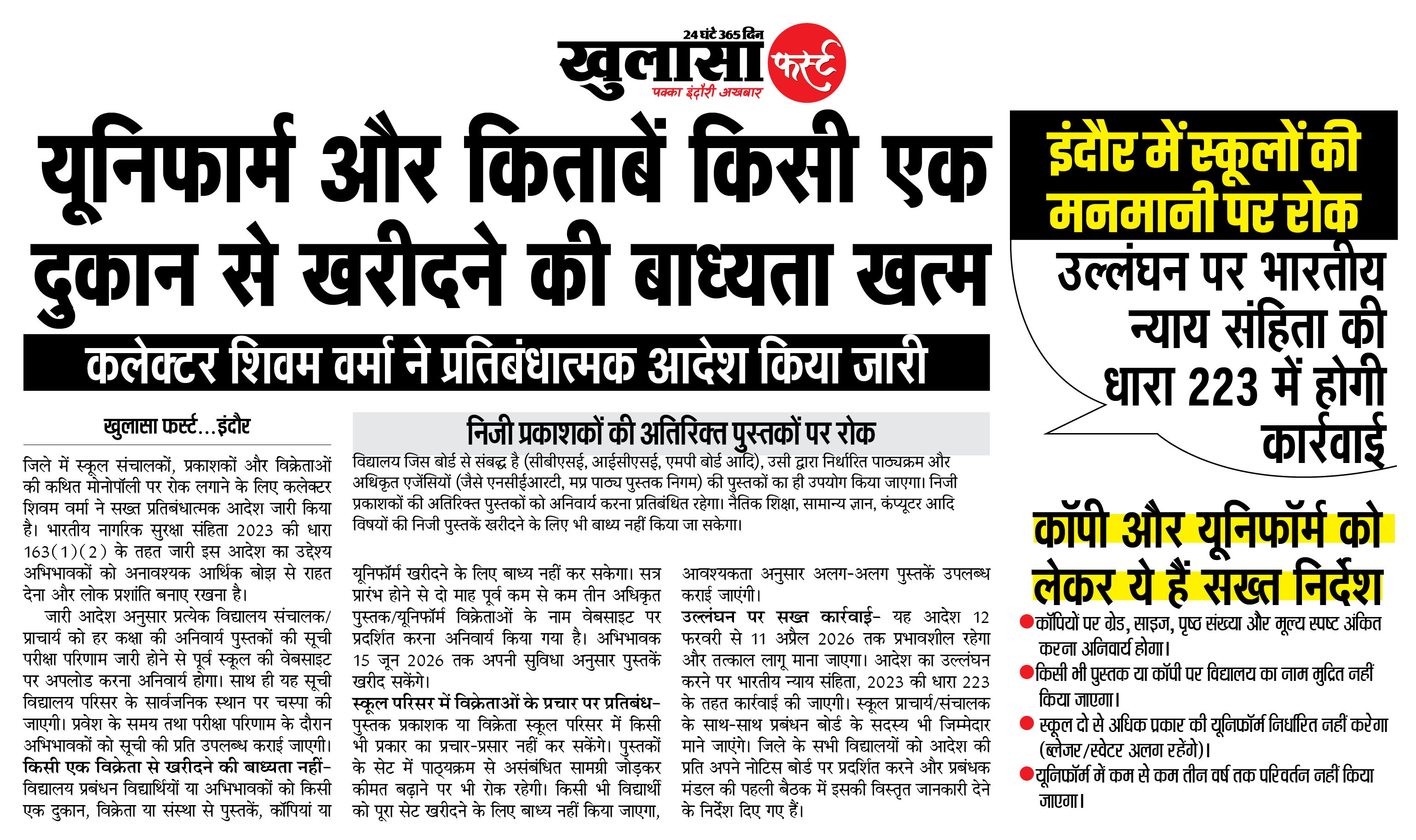 जिले में स्कूल संचालकों, प्रकाशकों और विक्रेताओं की कथित मोनोपॉली पर रोक लगाने के लिए कलेक्टर शिवम वर्मा ने सख्त प्रतिबंधात्मक आदेश जारी किया है। भारतीय नागरिक सुरक्षा संहिता 2023 की धारा 163(1)(2) के तहत जारी इस आदेश का उद्देश्य अभिभावकों को अनावश्यक आर्थिक बोझ से राहत देना और लोक प्रशांति बनाए रखना है।