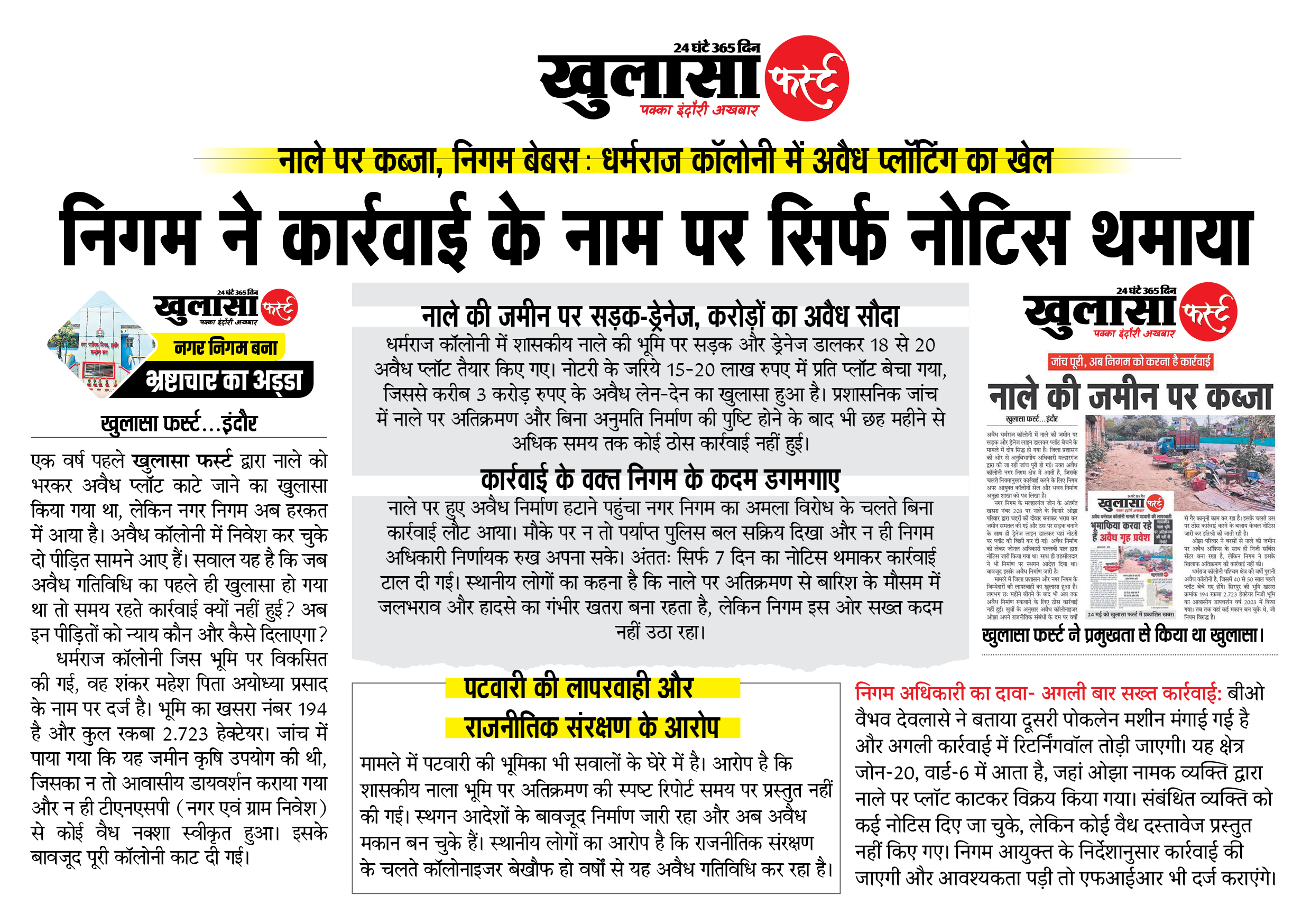 धर्मराज कॉलोनी में शासकीय नाले की भूमि पर सड़क और ड्रेनेज डालकर 18 से 20 अवैध प्लॉट तैयार किए गए। नोटरी के जरिये 15-20 लाख रुपए में प्रति प्लॉट बेचा गया, जिससे करीब 3 करोड़ रुपए के अवैध लेन-देन का खुलासा हुआ है। प्रशासनिक जांच में नाले पर अतिक्रमण और बिना अनुमति निर्माण की पुष्टि होने के बाद भी छह महीने से अधिक समय तक कोई ठोस कार्रवाई नहीं हुई।