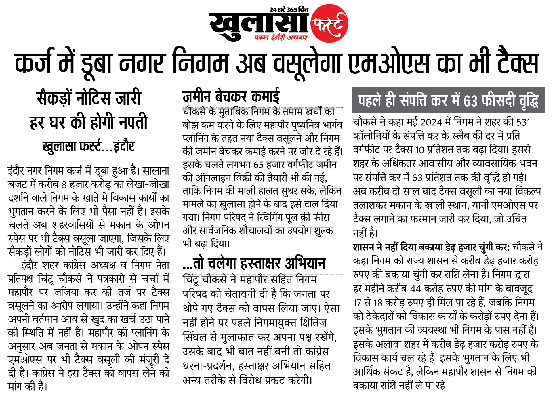 चौकसे ने कहा मई 2024 में निगम ने शहर की 531 कॉलोनियों के संपत्ति कर के स्लैब की दर में प्रति वर्गफीट पर टैक्स 10 प्रतिशत तक बढ़ा दिया। इससे शहर के अधिकतर आवासीय और व्यावसायिक भवन पर संपत्ति कर में 63 प्रतिशत तक की वृद्धि हो गई। अब करीब दो साल बाद टैक्स वसूली का नया विकल्प तलाशकर मकान के खाली स्थान, यानी एमओएस पर टैक्स लगाने का फरमान जारी कर दिया, जो उचित नहीं है।