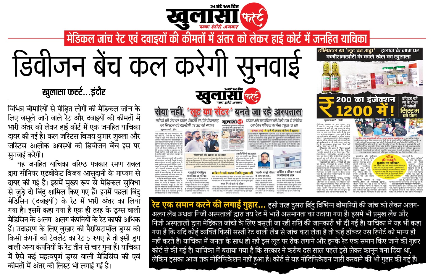 विभिन्न बीमारियों से पीड़ित लोगों की मेडिकल जांच के लिए वसूले जाने वाले रेट और दवाइयों की कीमतों में भारी अंतर को लेकर हाई कोर्ट में एक जनहित याचिका दायर की गई है। कल जस्टिस विजय कुमार शुक्ला और जस्टिस आलोक अवस्थी की डिवीजन बेंच इस पर सुनवाई करेगी।