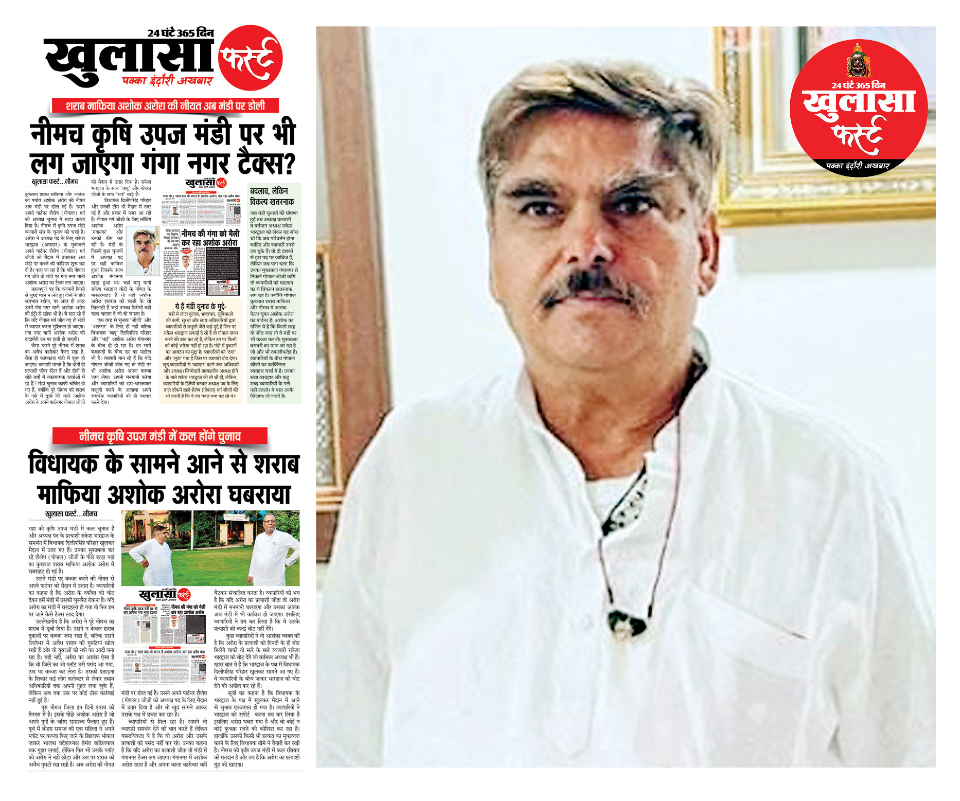यहां के कुख्यात शराब माफिया और आतंक का पर्याय बने हुए अशोक अरोरा के पतन की शुरुआत हो गई है। उसका पार्टनर शैलेष (गोपाल) जीजी कृषि उपज मंडी का चुनाव बुरी तरह हार गया है। इसी के साथ अरोरा का मंडी पर कब्जा करने का षड़यंत्र विफल हो गया है।