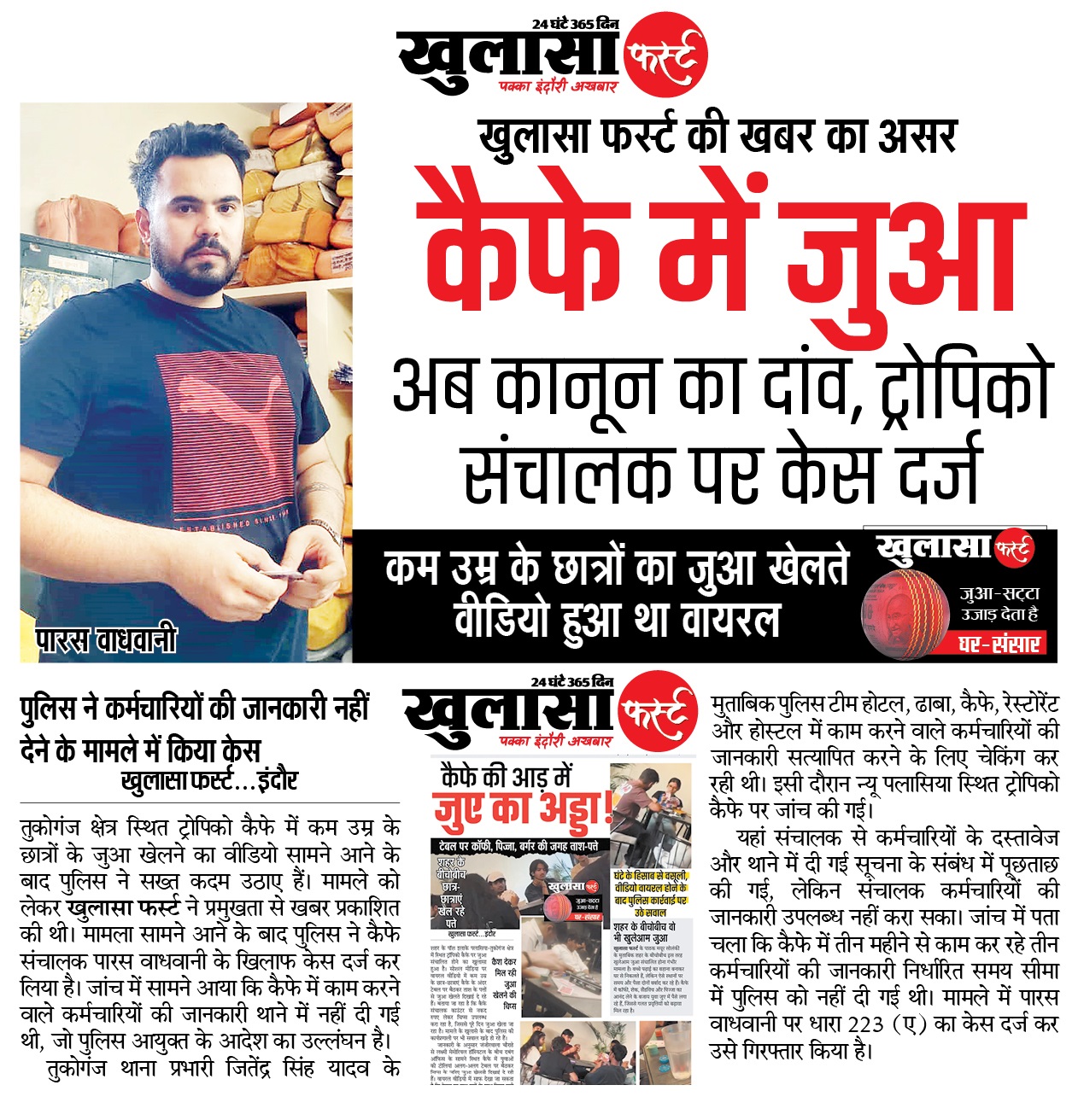 तुकोगंज क्षेत्र स्थित ट्रोपिको कैफे में कम उम्र के छात्रों के जुआ खेलने का वीडियो सामने आने के बाद पुलिस ने सख्त कदम उठाए हैं। मामले को लेकर खुलासा फर्स्ट ने प्रमुखता से खबर प्रकाशित की थी।