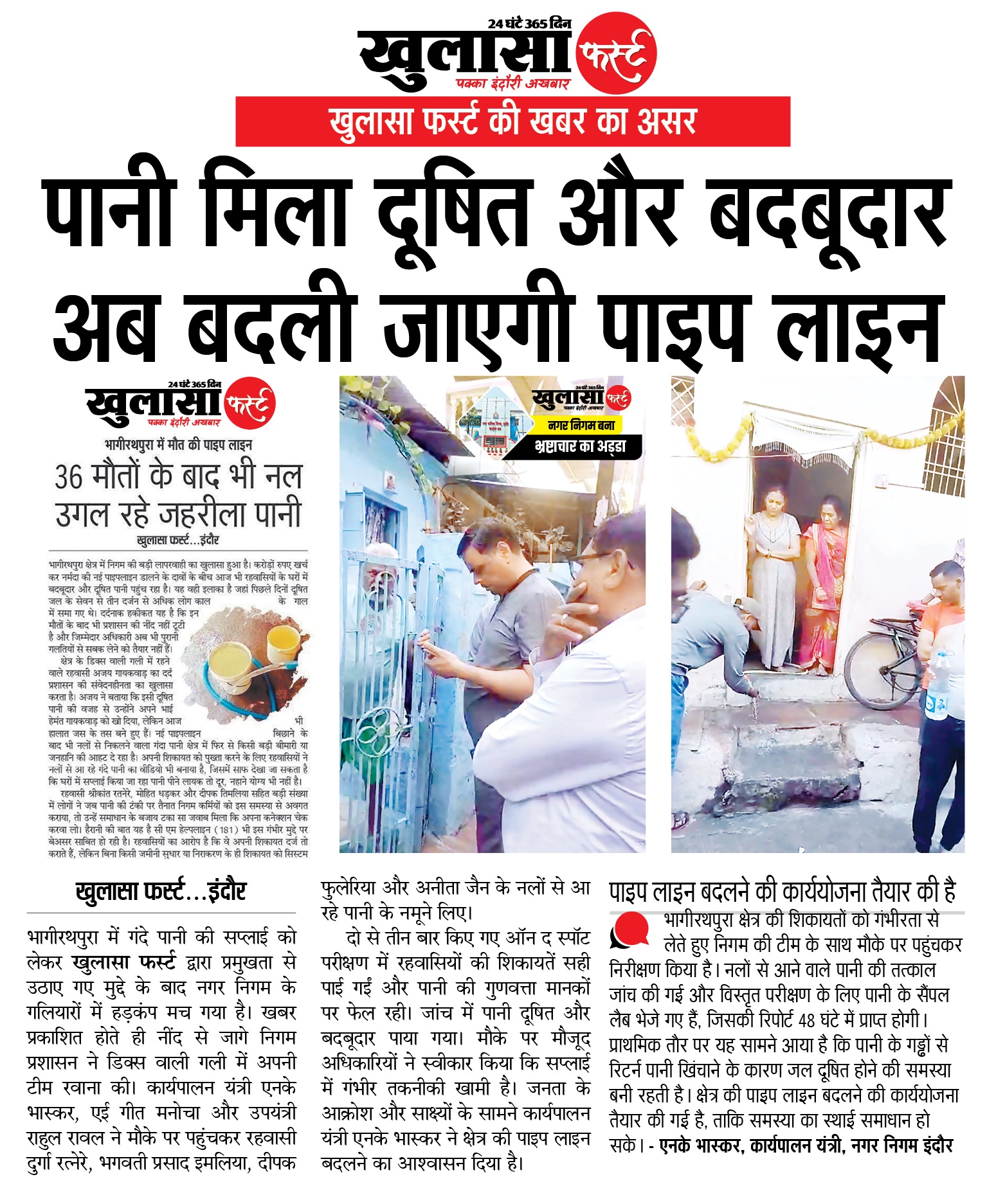 भागीरथपुरा में गंदे पानी की सप्लाई को लेकर खुलासा फर्स्ट द्वारा प्रमुखता से उठाए गए मुद्दे के बाद नगर निगम के गलियारों में हड़कंप मच गया है। खबर प्रकाशित होते ही नींद से जागे निगम प्रशासन ने डिक्स वाली गली में अपनी टीम रवाना की।