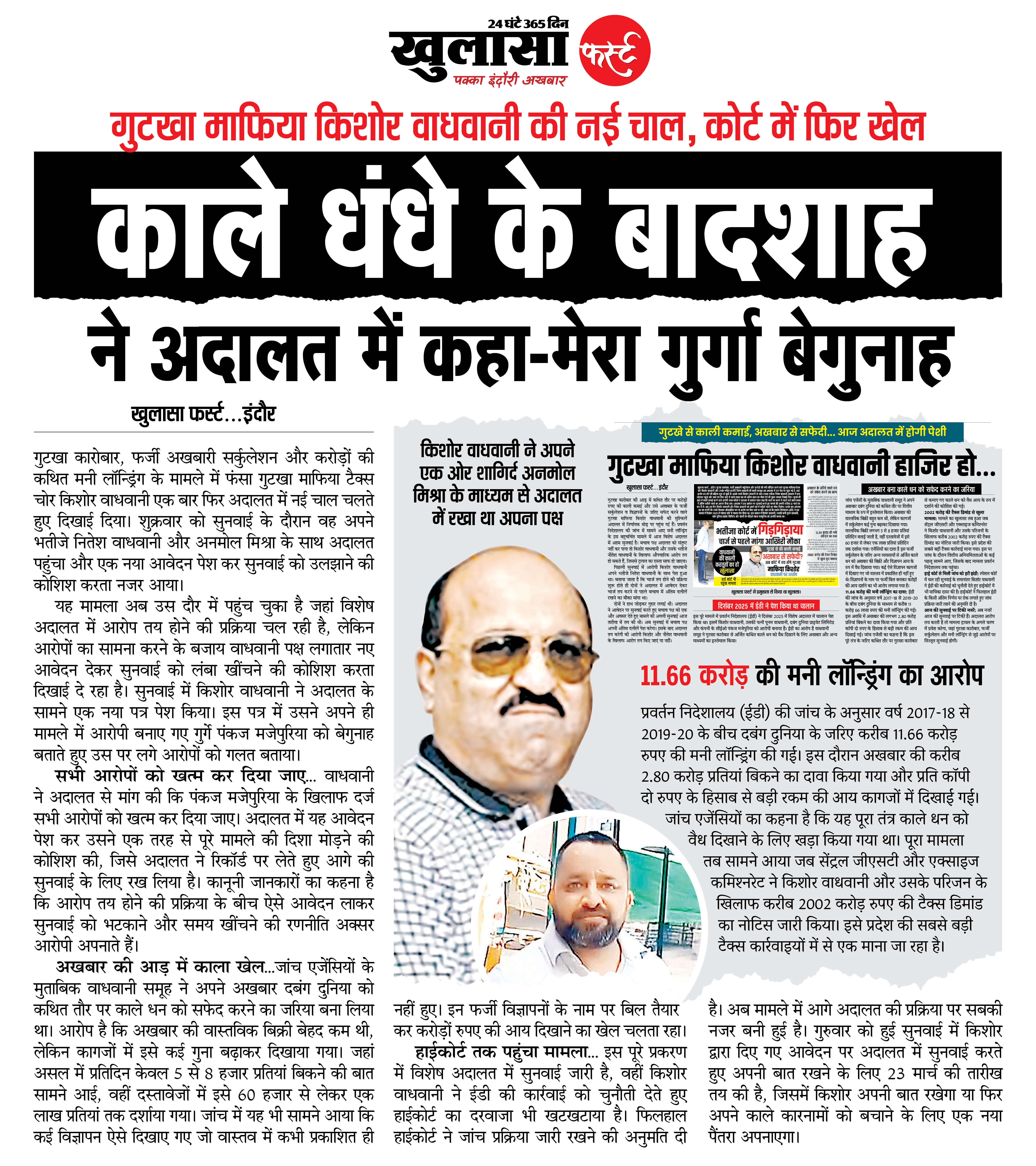गुटखा कारोबार, फर्जी अखबारी सर्कुलेशन और करोड़ों की कथित मनी लॉन्ड्रिंग के मामले में फंसा गुटखा माफिया टैक्स चोर किशोर वाधवानी एक बार फिर अदालत में नई चाल चलते हुए दिखाई दिया। शुक्रवार को सुनवाई के दौरान वह अपने भतीजे नितेश वाधवानी और अनमोल मिश्रा के साथ अदालत पहुंचा और एक नया आवेदन पेश कर सुनवाई को उलझाने की कोशिश करता नजर आया।