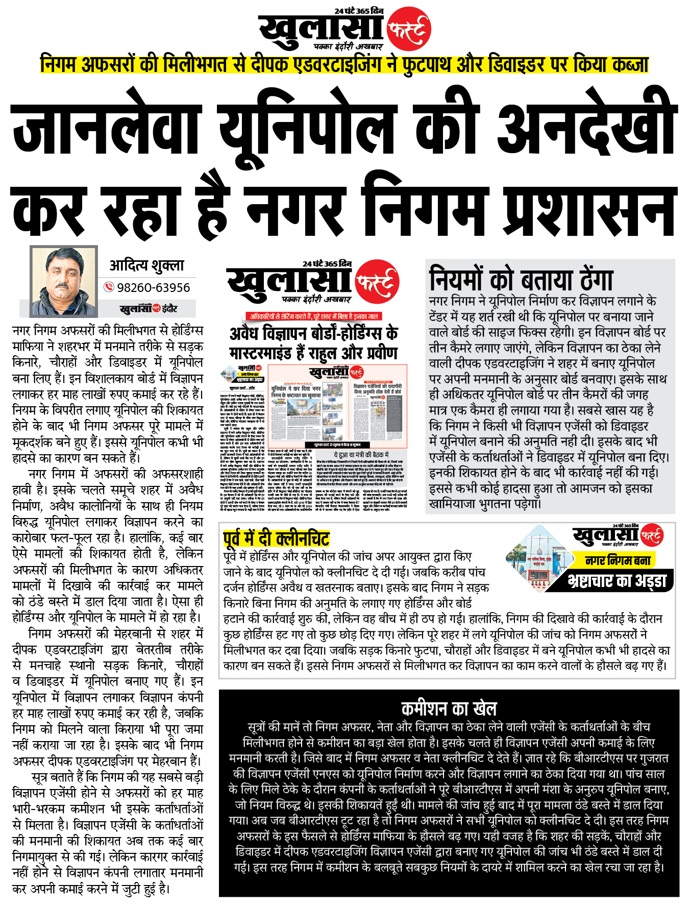 जानलेवा यूनिपोल की अनदेखी कर रहा है नगर निगम प्रशासन: निगम अफसरों की मिलीभगत से दीपक एडवरटाइजिंग ने फुटपाथ और डिवाइडर पर किया कब्जा