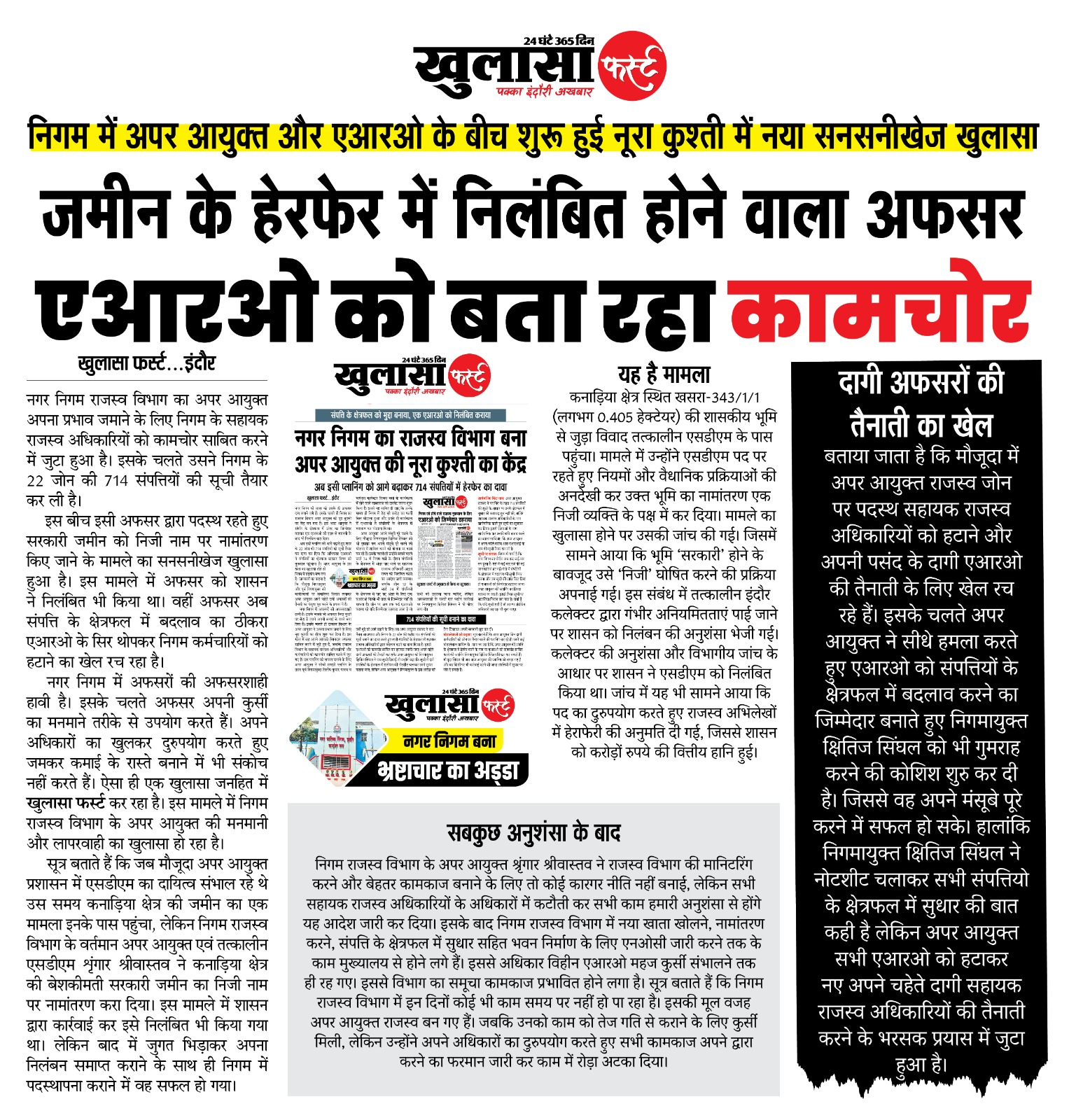 नगर निगम में अफसरों की अफसरशाही हावी है। इसके चलते अफसर अपनी कुर्सी का मनमाने तरीके से उपयोग करते हैं। अपने अधिकारों का खुलकर दुरुपयोग करते हुए जमकर कमाई के रास्ते बनाने में भी संकोच नहीं करते हैं। ऐसा ही एक खुलासा जनहित में खुलासा फर्स्ट कर रहा है। इस मामले में निगम राजस्व विभाग के अपर आयुक्त की मनमानी और लापरवाही का खुलासा हो रहा है।