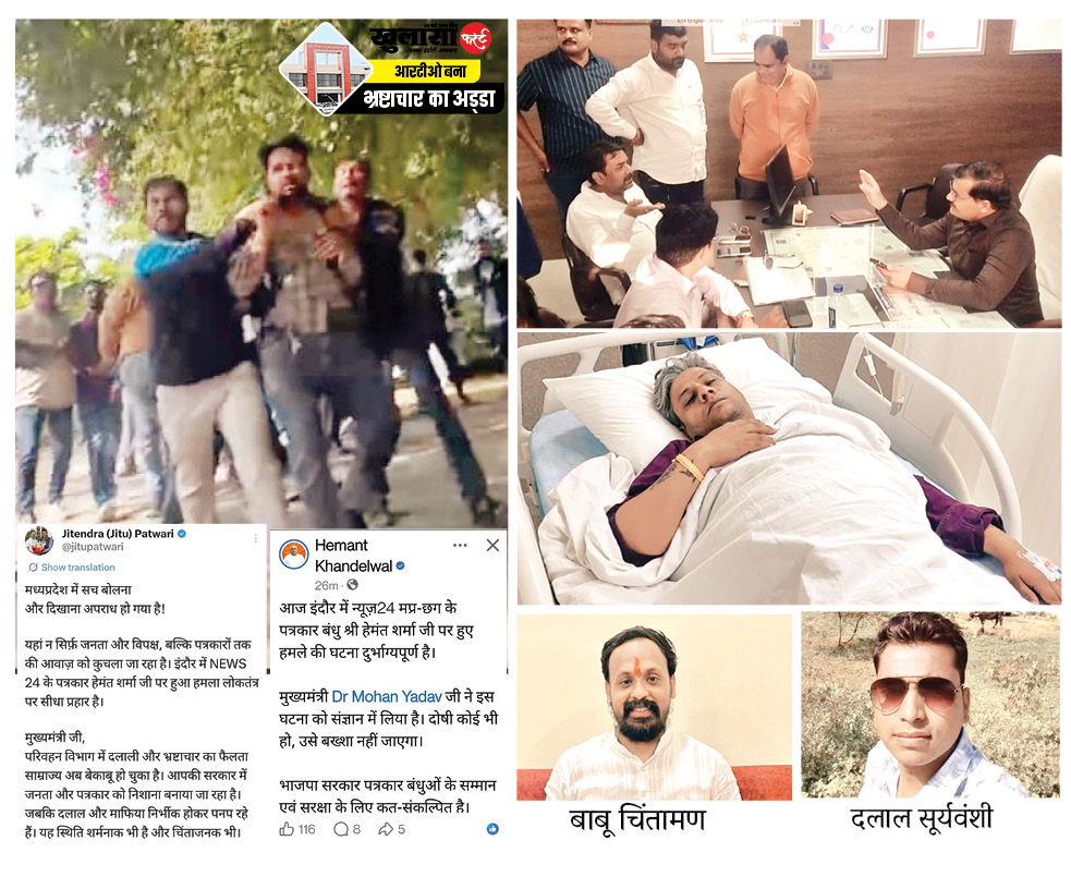 शहर के बदनाम रजिस्टर्ड टेरर ऑफिस (आरटीओ) की दीवारों के भीतर सालों से पल रहा भ्रष्टाचार शुक्रवार को एक बार फिर सरेआम बेनकाब हो गया। करोड़ों की उगाही, दफ्तरी दलालों की दादागीरी और ऊपर तक फैले संरक्षण की वजह से इस ऑफिस को शहर से बाहर बस इसीलिए स्थापित किया गया था, ताकि किसी भी घोटाले की भनक भोपाल या मीडिया तक देर से पहुंचे और पूरा मामला आसानी से ‘सेट’ किया जा सक, लेकिन पत्रकार पर हुए हमले ने पुलिस, प्रशासन और राजनीतिक दलों की भूमिका पर करारा सवाल खड़ा कर दिया है। इन्हें मीडिया सिर्फ अपने काम वक्त ही चाहिए? क्योंकि जब पत्रकार पर हमला होता है, तो सभी विभाग चुप्पी साध लेते हैं।