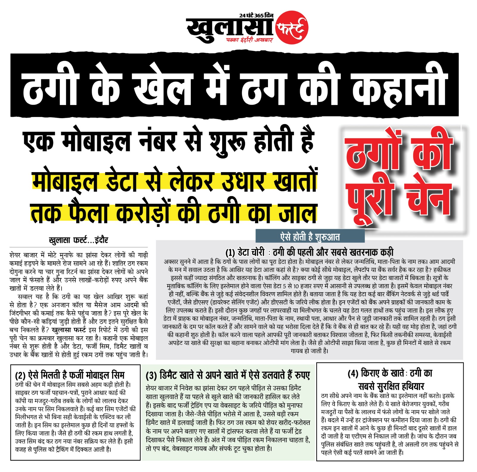 खुलासा फर्स्ट इस रिपोर्ट में ठगी की इस पूरी चेन का क्रमवार खुलासा कर रहा है। कहानी एक मोबाइल नंबर से शुरू होती है और डेटा, फर्जी सिम, डिमैट खातों व उधार के बैंक खातों से होती हुई रकम ठगों तक पहुंच जाती है।
