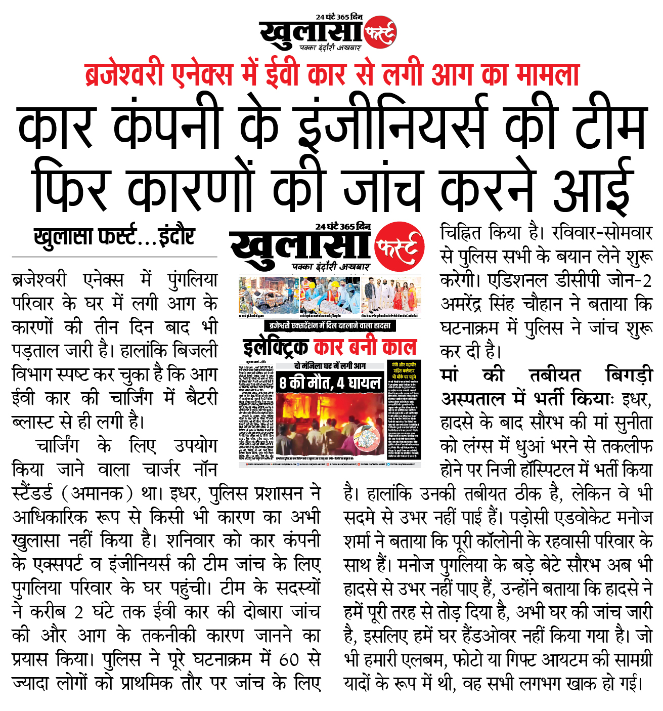 कार कंपनी के इंजीनियर्स की टीम फिर कारणों की जांच करने आई: ब्रजेश्वरी एनेक्स में ईवी कार से लगी आग का मामला