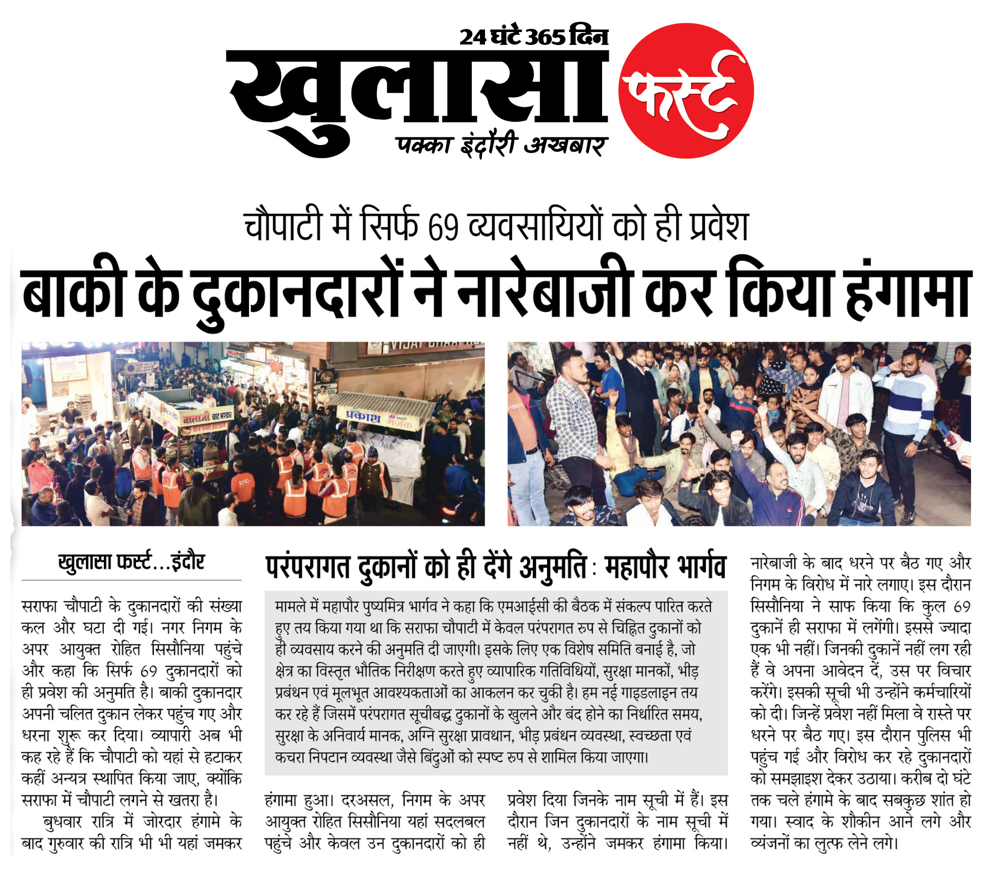 खुलासा फर्स्ट, इंदौर । सराफा चौपाटी को लेकर चल रहे विवाद में कल नया मोड़ आया, जबकि राजस्व समिति प्रभारी निरंजनसिंह चौहान ने कहा कि जो 69 दुकानें तय की गई हैं, उनकी संख्या में बदलाव हो सकता है। यानी ये