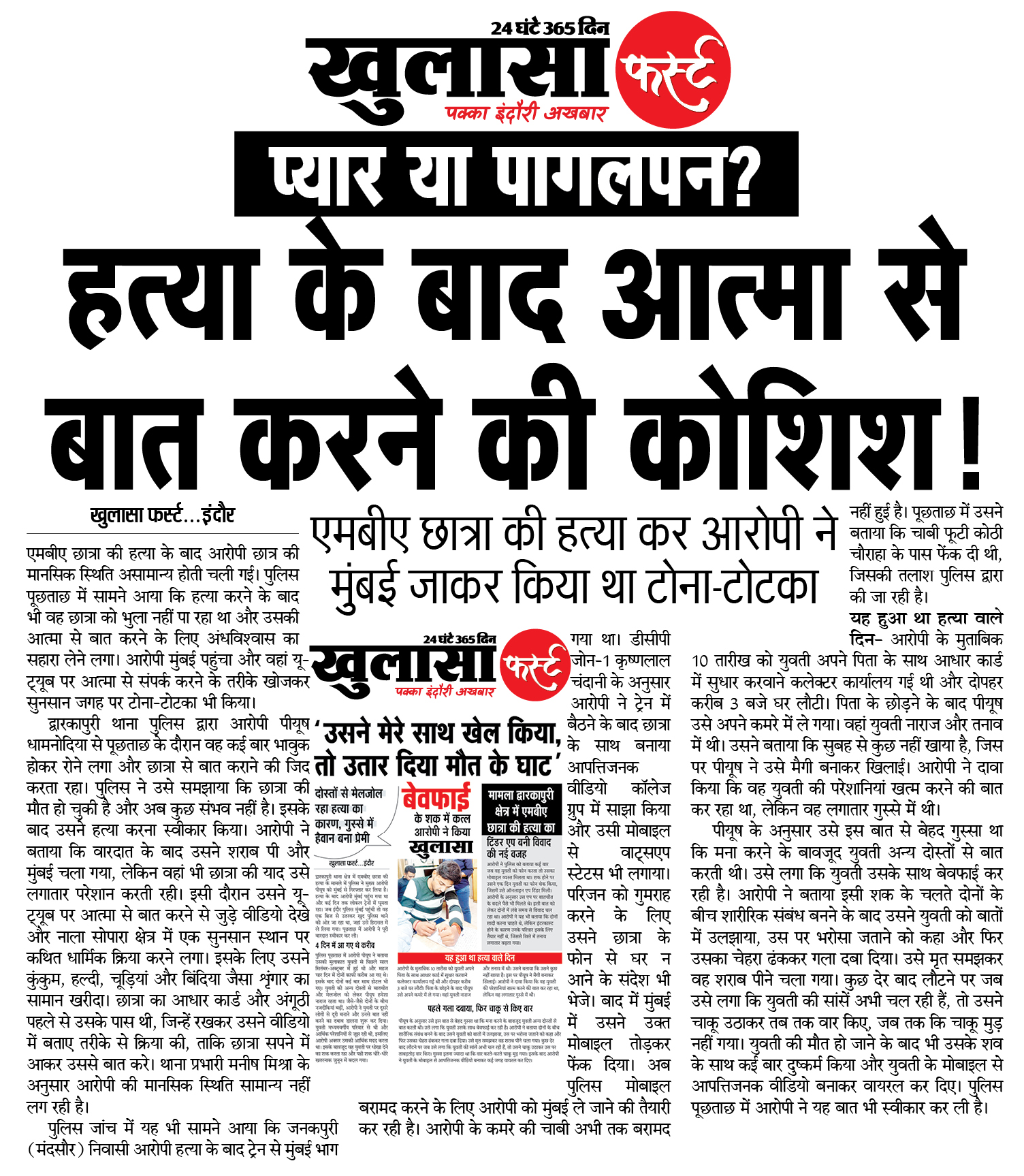 एमबीए छात्रा की हत्या के बाद आरोपी छात्र की मानसिक स्थिति असामान्य होती चली गई। पुलिस पूछताछ में सामने आया कि हत्या करने के बाद भी वह छात्रा को भुला नहीं पा रहा था और उसकी आत्मा से बात करने के लिए अंधविश्वास का सहारा लेने लगा। आरोपी मुंबई पहुंचा और वहां यू-ट्यूब पर आत्मा से संपर्क करने के तरीके खोजकर सुनसान जगह पर टोना-टोटका भी किया।