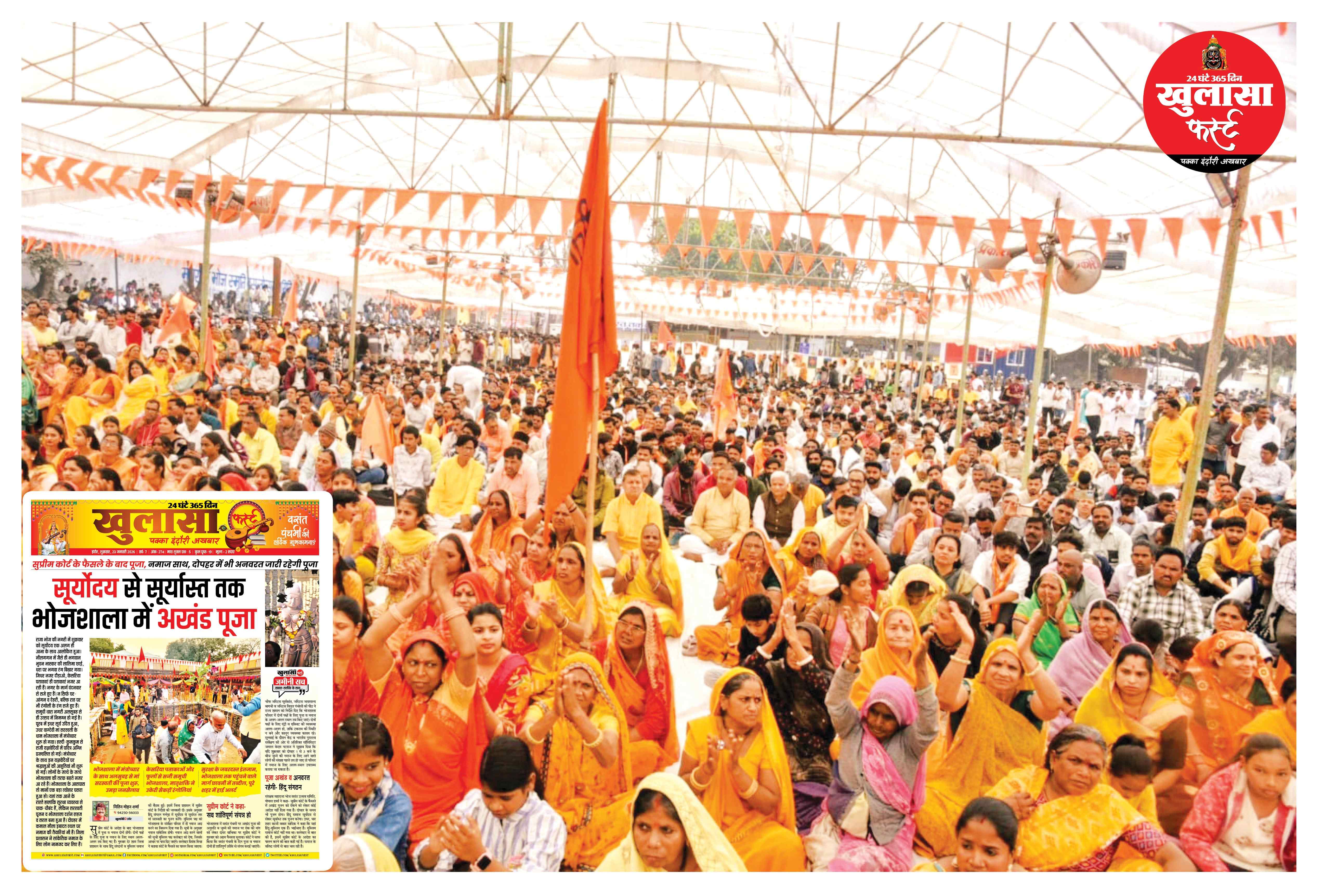 वसंत पंचमी पर नमाज व पूजा साथ-साथ के शोर के बीच आपका प्रिय पक्का इंदौरी खुलासा फर्स्ट ही इकलौता ऐसा अखबार था, जिसमे डंके की चोट पर लिखा था कि भोजशाला में सूर्योदय से सूर्यास्त तक अखंड पूजन होगा। ठीक वैसा ही हुआ।