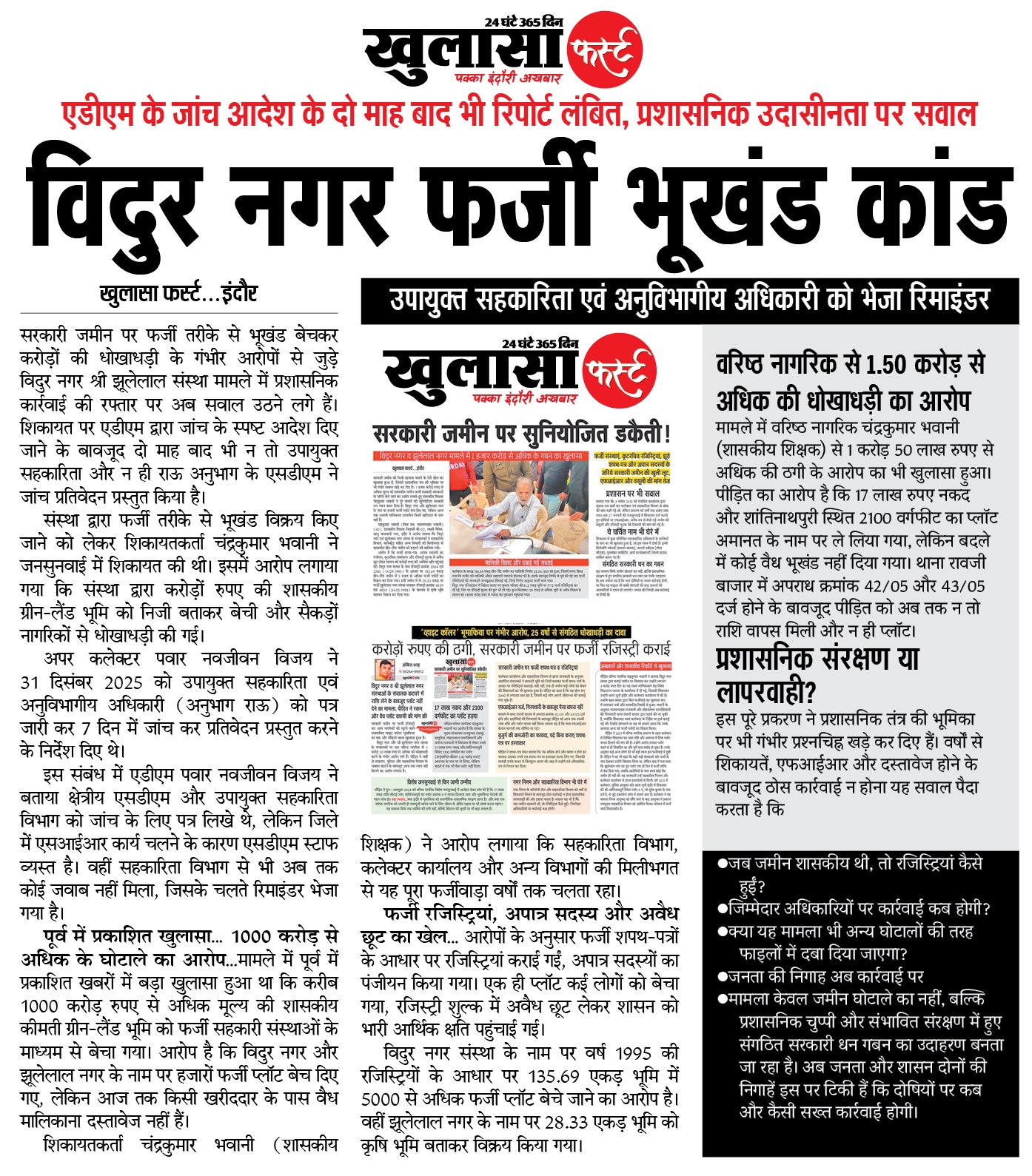 पूर्व में प्रकाशित खुलासा... 1000 करोड़ से अधिक के घोटाले का आरोप...मामले में पूर्व में प्रकाशित खबरों में बड़ा खुलासा हुआ था कि करीब 1000 करोड़ रुपए से अधिक मूल्य की शासकीय कीमती ग्रीन-लैंड भूमि को फर्जी सहकारी संस्थाओं के माध्यम से बेचा गया। आरोप है कि विदुर नगर और झूलेलाल नगर के नाम पर हजारों फर्जी प्लॉट बेच दिए गए, लेकिन आज तक किसी खरीददार के पास वैध मालिकाना दस्तावेज नहीं हैं।