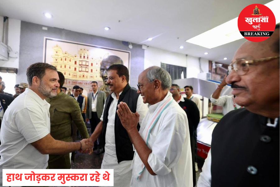 दिग्विजय सिंह से जब राहुल गांधी का आमना-सामना हुआ तो राहुल गांधी के चेहरे पर मुस्कराहट दौड़ गई, वहीं चिरपरिचित अंदाज में दिग्विजय का चेहरा भी मुस्कान से भरा हुआ था।
